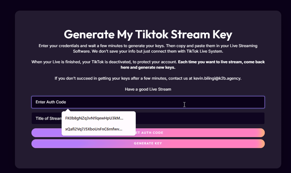 Wenn du deine Anmeldedaten nicht hast, kontaktiere uns unter: kevin@zenstream.link (oder bezahle zuerst dein Abonnement: https://tiktok-key-generator.zenstream.link/#payer)